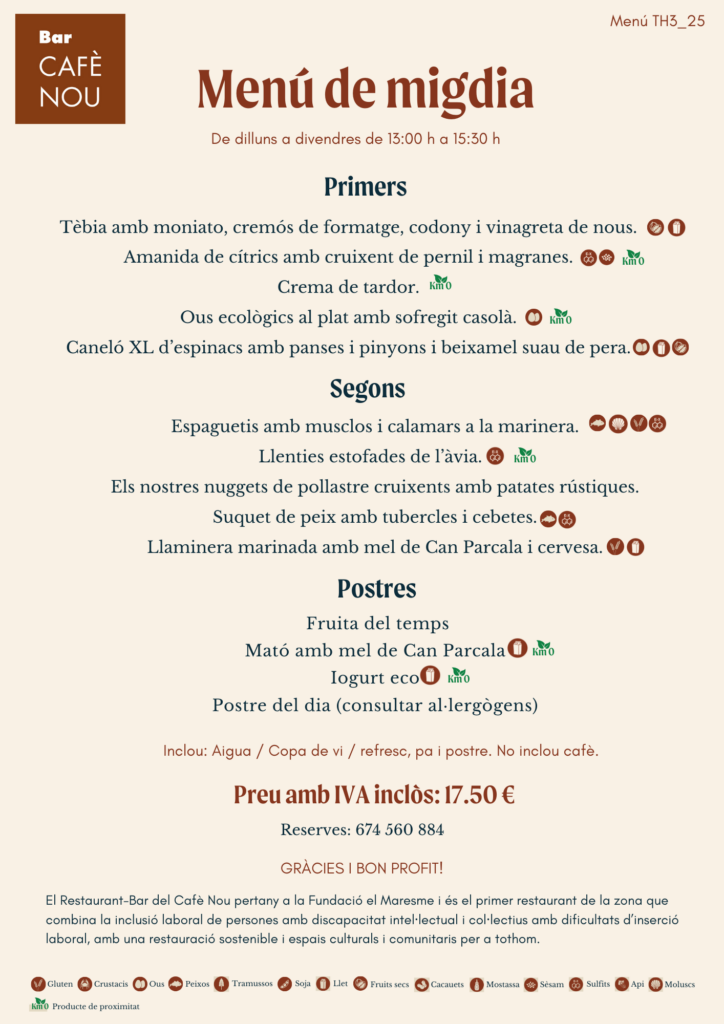 La cuina del Bar del Cafè Nou ofereix un 20% de productes amb la qualificació de productes de proximitat i un 10% de productes d’aliments amb segell ecològic. Així mateix, també tenim una carta preparada i apta per a persones amb intoleràncies alimentàries amb un 45% de productes sense gluten, un 45% de productes sense lactosa, un 15% vegà i un 55% ovolacteovegetarià.